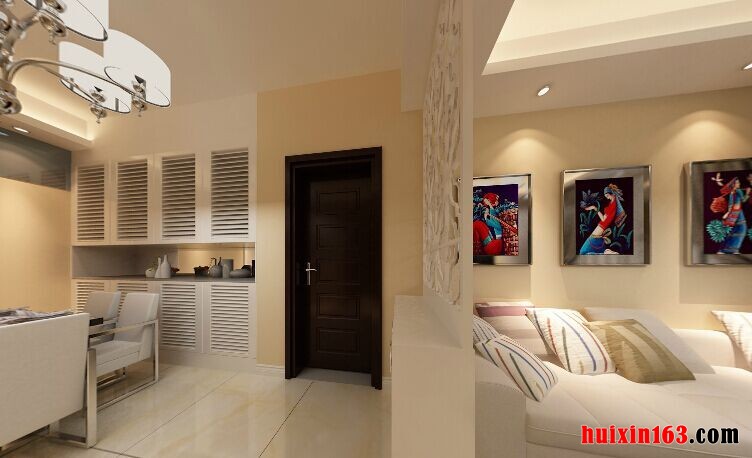 整个居室的空间面积并不是很大,通过设计师独具匠心的设计却显得比较温馨浪漫,在客厅的装饰布置当中,其沙发背景墙采用了浅暖色的乳胶漆,通过暖色系的色彩营造出一份家的感觉,而且墙面上还悬挂了几幅壁画,鲜明的色彩反差起到一个提色的作用,但又不是很抢眼,平顶式的石膏板吊顶,搭配上一盏个性的吊灯,让空间显得比较唯美、时尚,落地窗的设计搭配上做工精致的窗帘,也展现出一种别样的美感,纯白色布艺的沙发添加,白色的茶几以及电视柜,与整个空间有着一个相互协调的感觉,在入户门的右手边就是餐厅的设计,简单的造型也不是浪漫感。