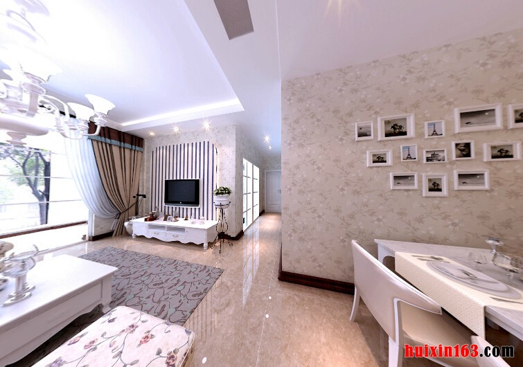 在客厅里面布置了非常多的白色的灯光,包括白色的灯带,射灯以及水晶灯,地面上铺设的是亮光的瓷砖,墙面上是浅色碎花纹的墙纸,打造出一个明亮的水晶宫似的宫殿。在电视背景墙上铺设黑白条纹的墙纸,体现出简约的设计线条,沙发背景墙和沙发套上面的碎花图案让人能够感受到自然的亲近,在墙面上张挂的长条的画卷维空间增添了一些文化的内涵。